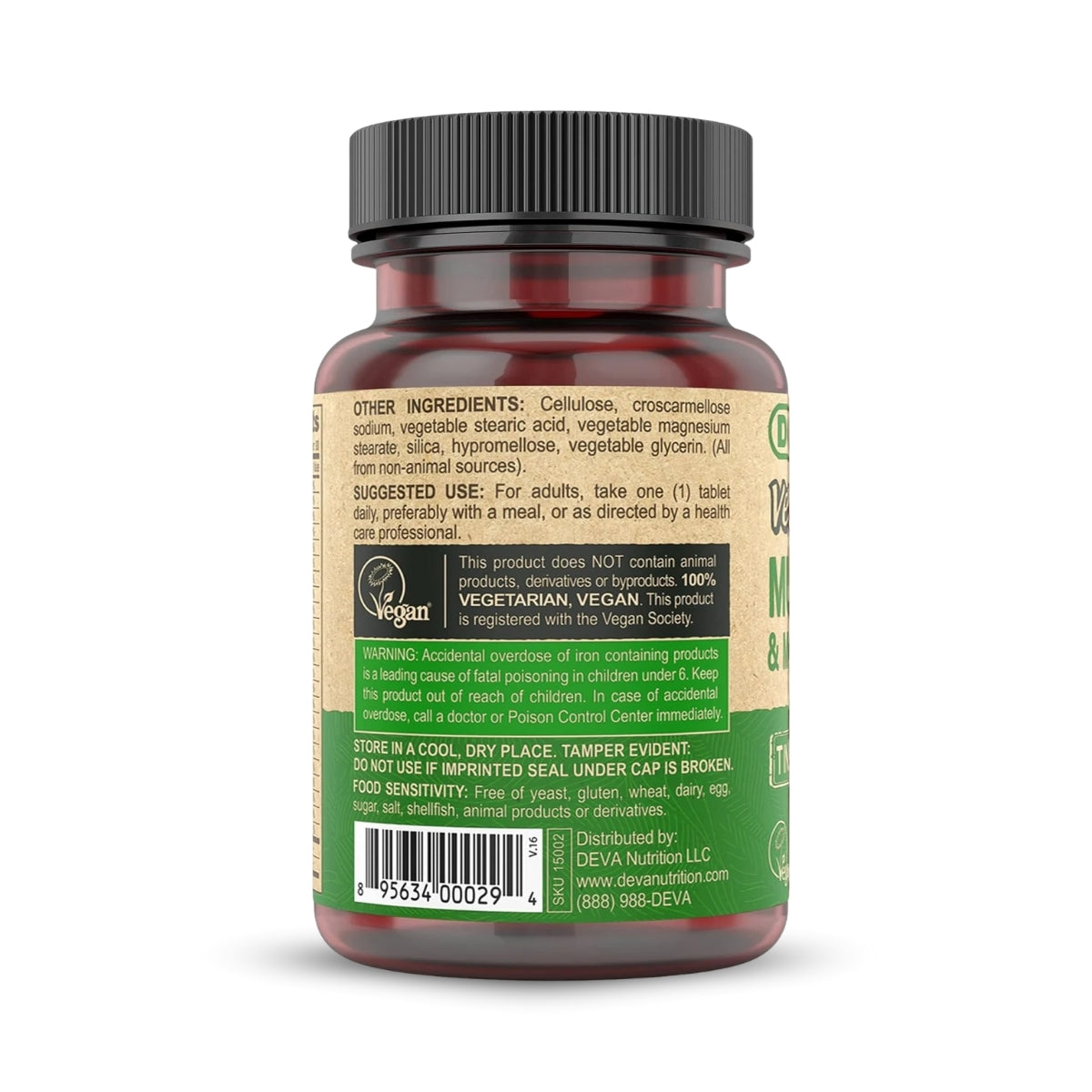 DEVA Tiny Tablets Vegan Multivitamins are specially formulated to provide comprehensive nutrition in a convenient, easy-to-swallow, tiny tablet. This multivitamin includes iron, vitamin C, B complex, B12, vitamin E, and zinc, providing essential nutrients for daily health and wellness. Ideal for both women and men, these gluten-free tablets support energy, immune function, and overall vitality. Perfect for vegans looking to maintain balanced nutrition without animal-derived ingredients.