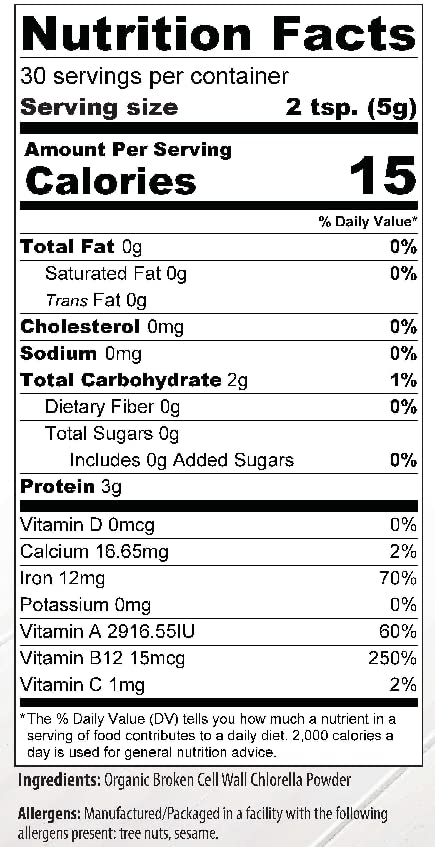 - Increased digestibility and absorption up to 80% compared to traditionally processed chlorella