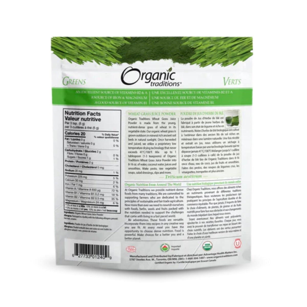 Organic Traditions Wheat Grass Juice Powder is a concentrated superfood made from freshly harvested, young wheat grass. This nutrient-dense powder is rich in chlorophyll, vitamins, minerals, and antioxidants to help alkalize the body, support detoxification, and promote overall vitality. With its clean, refreshing taste, it mixes easily into water, smoothies, or juices for a quick and powerful health boost.
